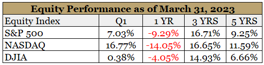 For markets, the robust employment reports fell into the “good news is actually bad news” category, dashing hopes that the Fed would pause its rate hikes or even cut rates in the back half of 2023. This disappointment led to January gains giving way to February drops. Markets limped into March but ultimately finished with monthly and quarterly gains.
